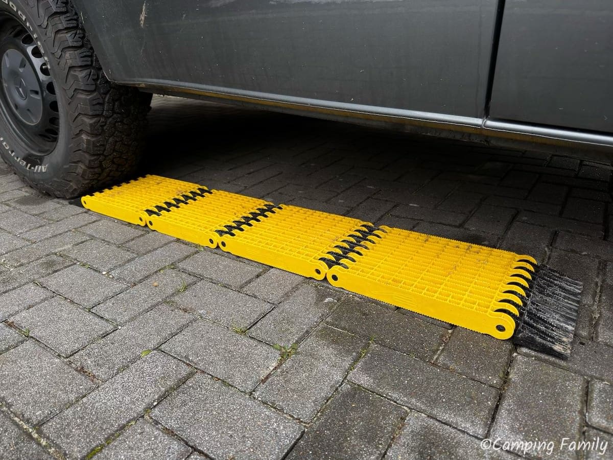 Die Uniko 6in1 Faltrampe kann man im flachen Zustand schon ausgezeichnet als Traktionshilfe nutzen. Im Gegensatz zu einfachen und dünnen Matten fliegt die einem bei durchdrehenden Reifen auch nicht hinten wieder raus. Dank der griffigen und stabilen Oberfläche finden die Reifen entsprechenden Grip und drehen nicht durch.