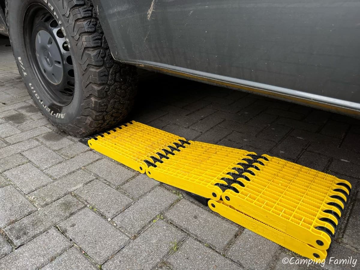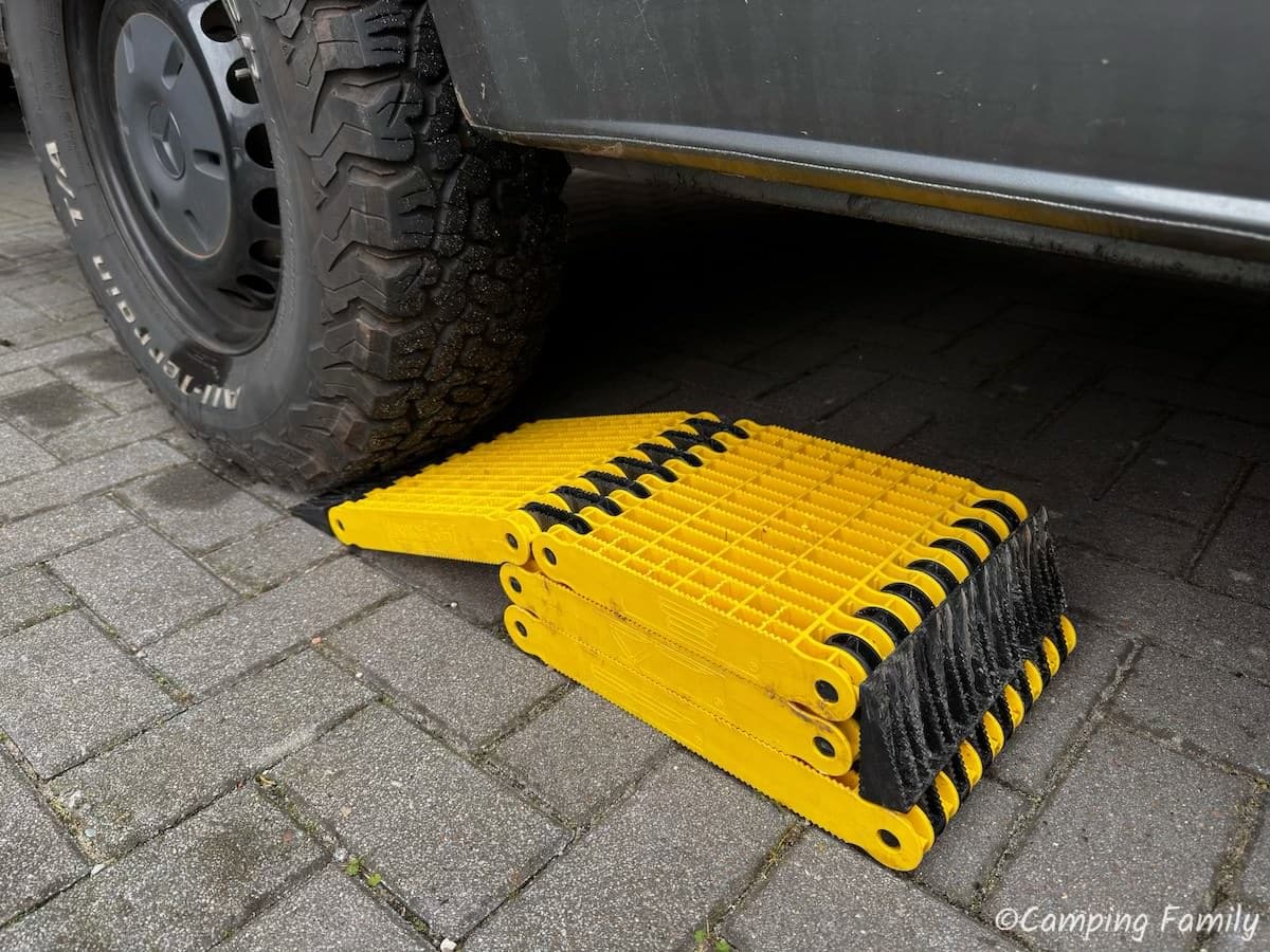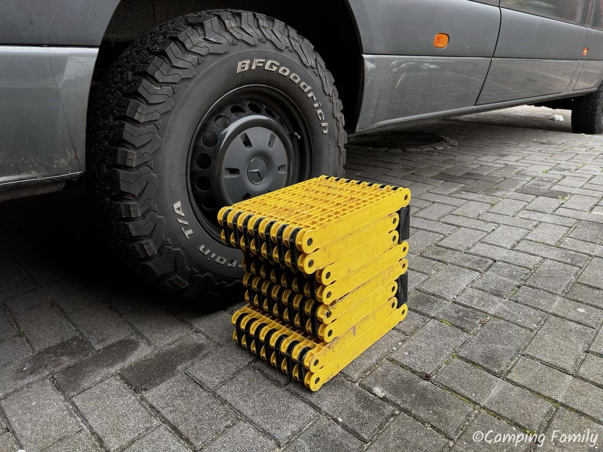 Wer eine Hubstützenanlage oder eine Zusatzluftfederung hat, kann das Fahrzeug automatisch nivellieren lassen. Für alle anderen gibt es die Möglichkeit, manuell zu nivellieren, indem man sogenannte Auffahrkeile verwendet. Wir haben mit dem Milenco Quattro* über die Jahre ausgezeichnete Erfahrungen gesammelt. Mit einer Höhe von 160 mm, vier Stufen und einer Auffahrfläche von 24 cm auch sehr einfach zu bedienen. Solche großen Keile haben jedoch einen Nachteil, ihr Packmaß benötigt viel Platz. Sie dienen „nur“ als Auffahrkeil und sind für nichts anderes geeignet. Hier wäre es doch deutlich praktischer, eine eierlegende Wollmilchsau zu haben, wo Auffahrkeil, Sandblech, Traktionshilfe, Unterlegkeil, Auffahrrampe und vieles mehr in einem vorhanden sind. Gibt es nicht? Doch gibt es und nennt sich Uniko 6 in 1*.