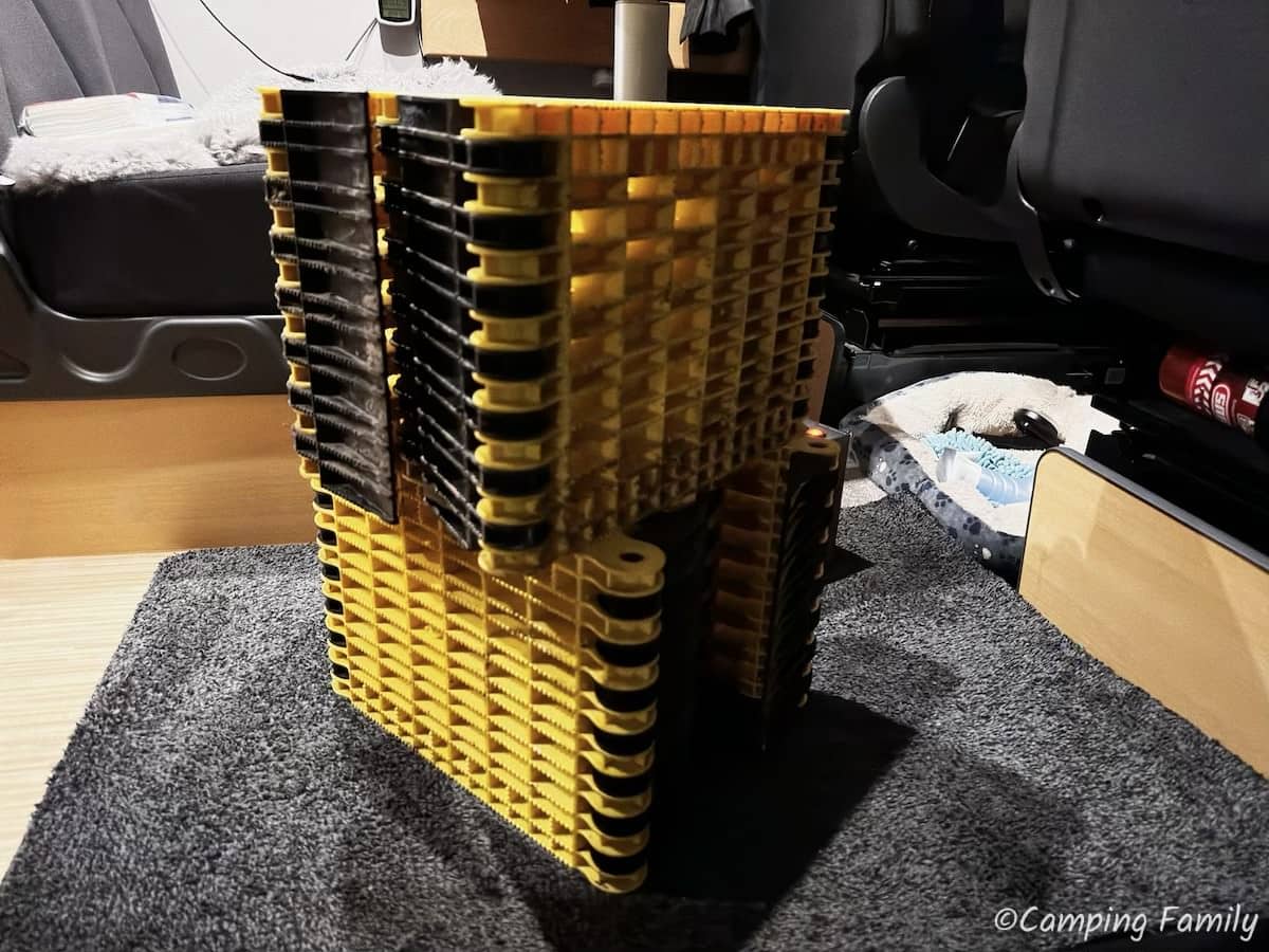Fangen wir mal mit der sicherlich am meisten genutzten Funktion als Auffahrkeil an. Die Rampe wird dann einfach ge bzw. entfaltet und dadurch stehen einem drei unterschiedliche Höhen mit 4,5 cm (1 Element), 9 cm (2 Elemente) und 13 cm (3 Elemente) zum Ausgleichen zur Verfügung.
