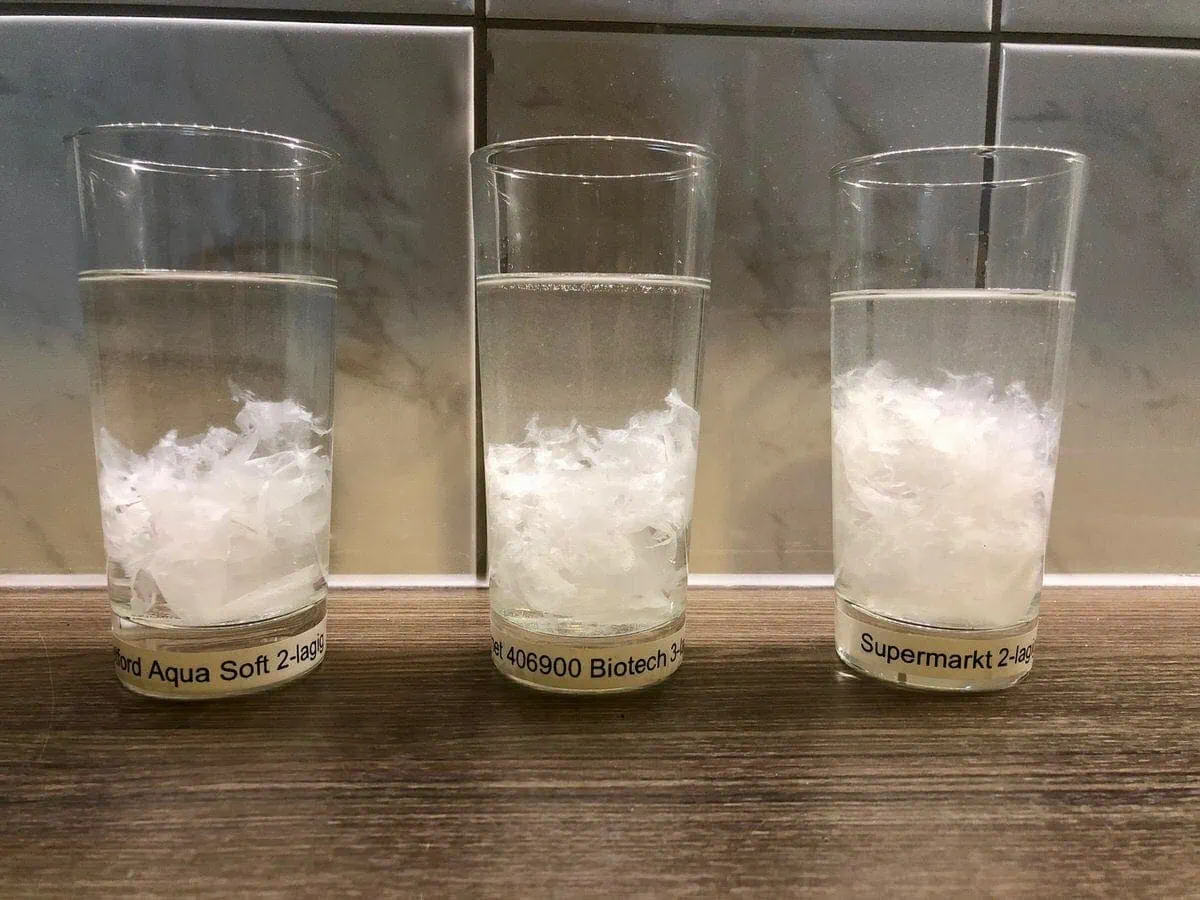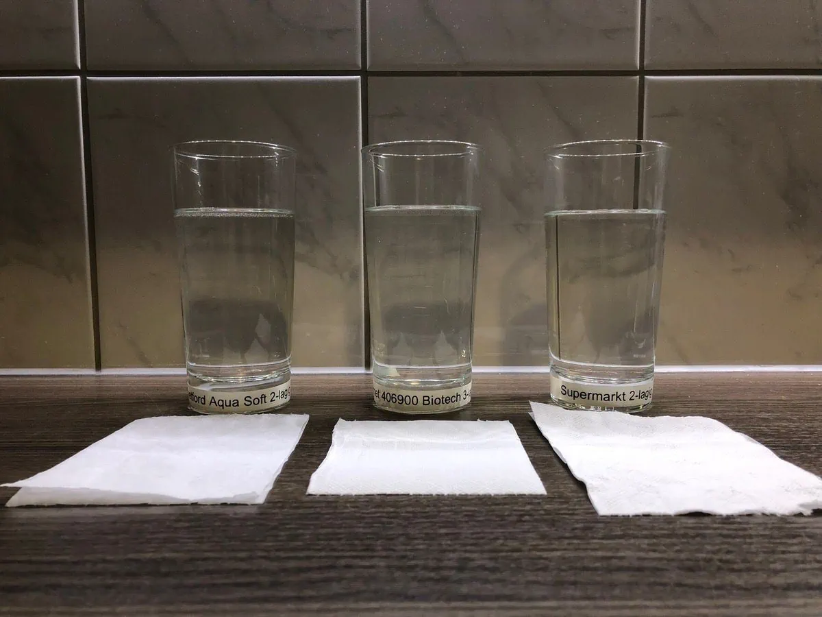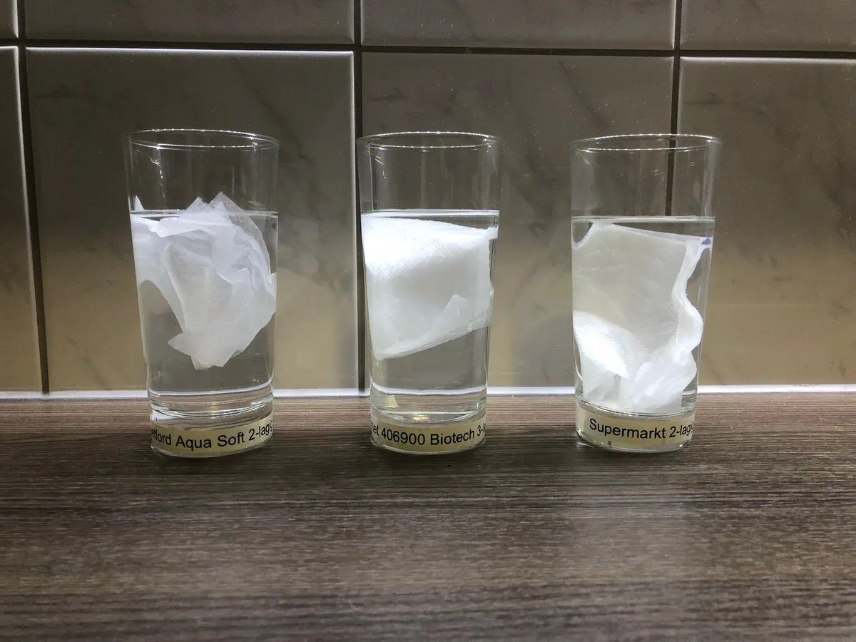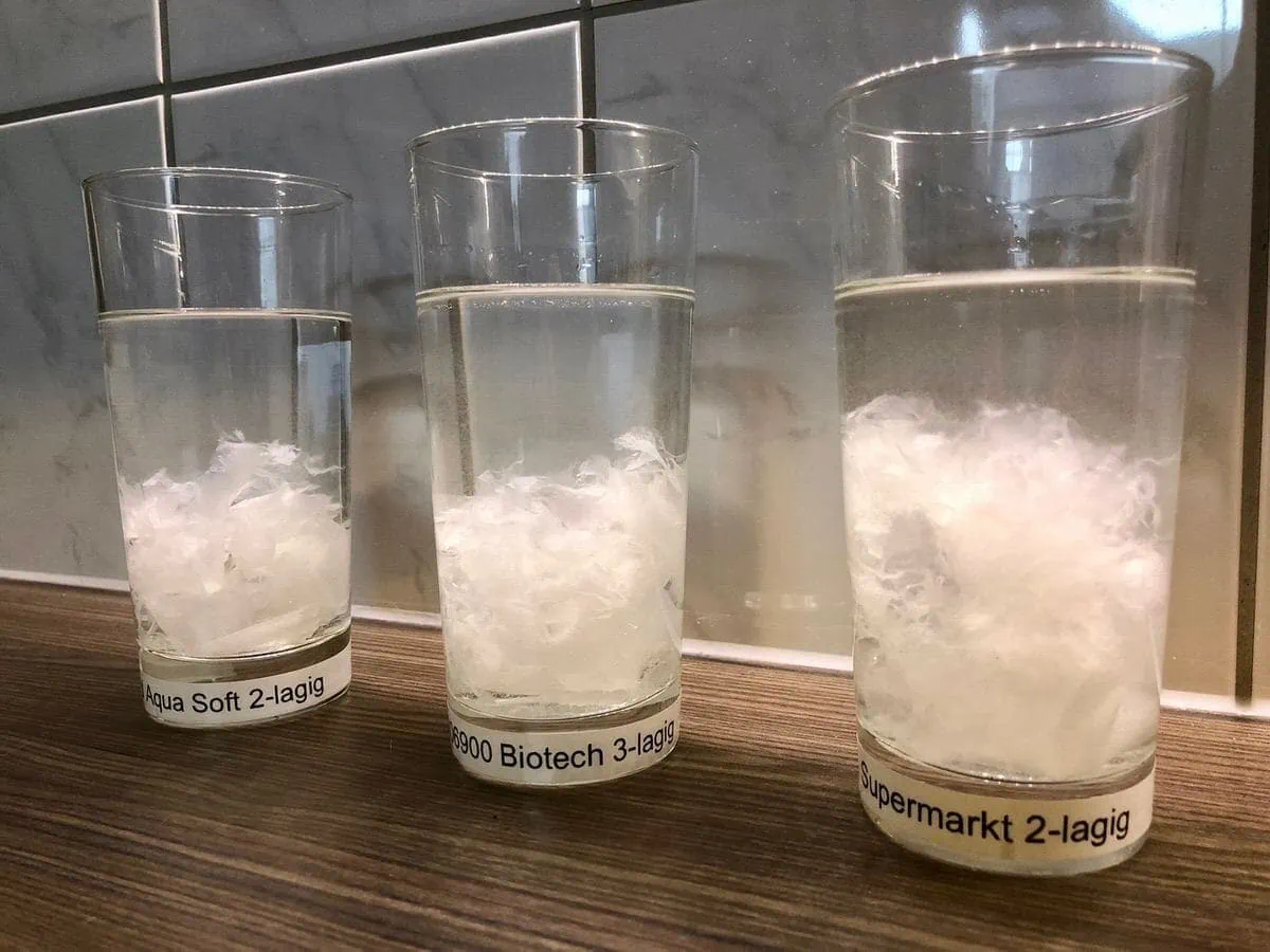 Ich habe von jedem einen Abriss des Papiers genommen und in ein beschriftetes Wasserglas gegeben. Das Papier sollte sich bestmöglich von alleine und somit ohne jegliche Bewegung auflösen. Auf den Bildern sieht man die nicht eingetretene Zersetzung nach 10 Stunden und die Zersetzung nach einem kleinen Schubser.