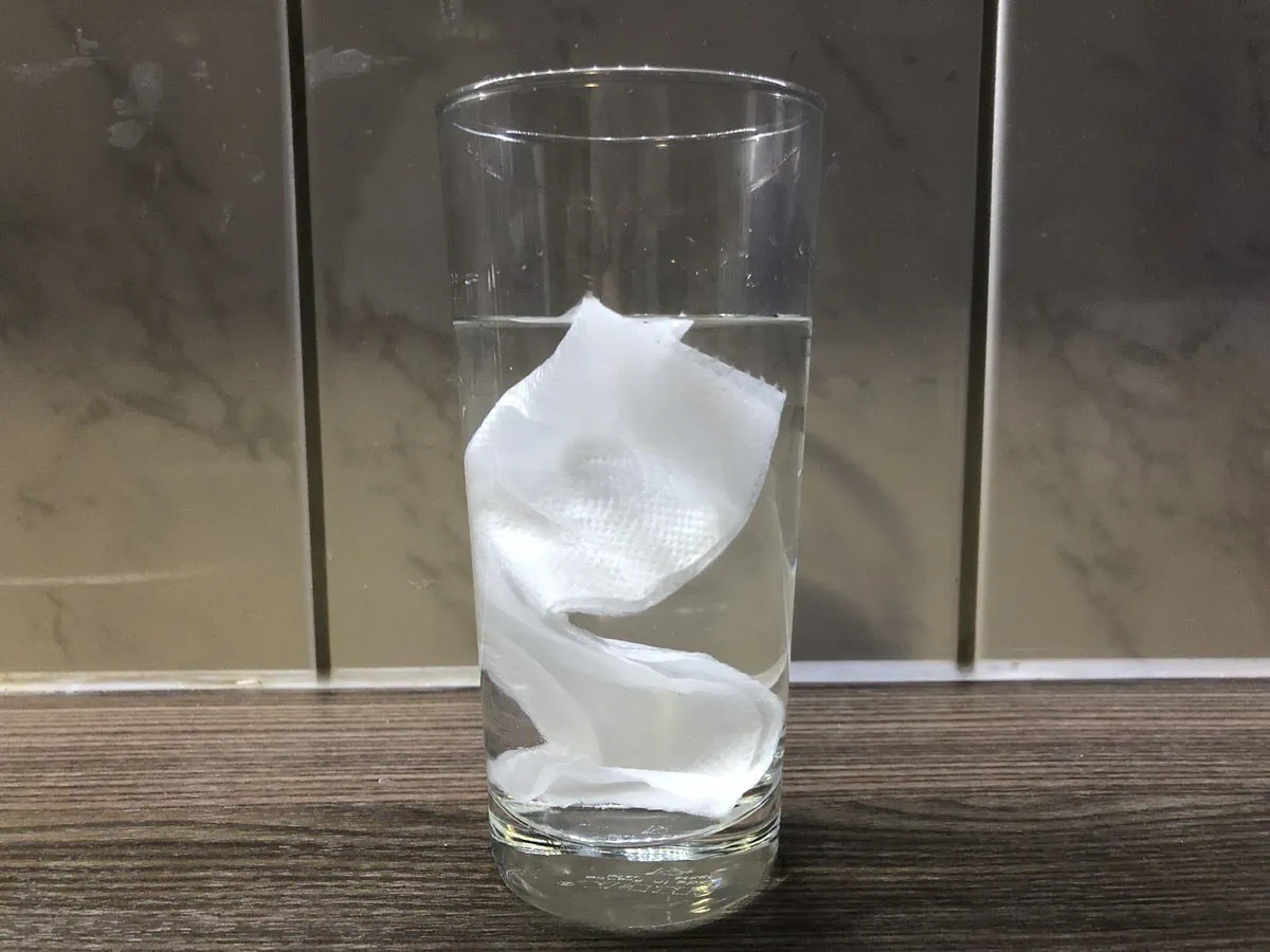 Nach 10 Stunden war optisch kein Unterschied zu erkennen. Eine Zersetzung hat bis dato noch nicht wirklich stattgefunden. Man muss bedenken, dass sich das Toilettenpapier alleine im Wasser befunden hat. Es fand während der gesamten Zeit keinerlei Bewegung statt. Diese macht nämlich den großen Unterschied aus. Nachdem ich das Papier ein wenig im Wasser zirkulieren gelassen habe, hat es sich sofort in Einzelteile zerlegt.