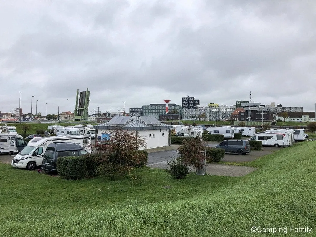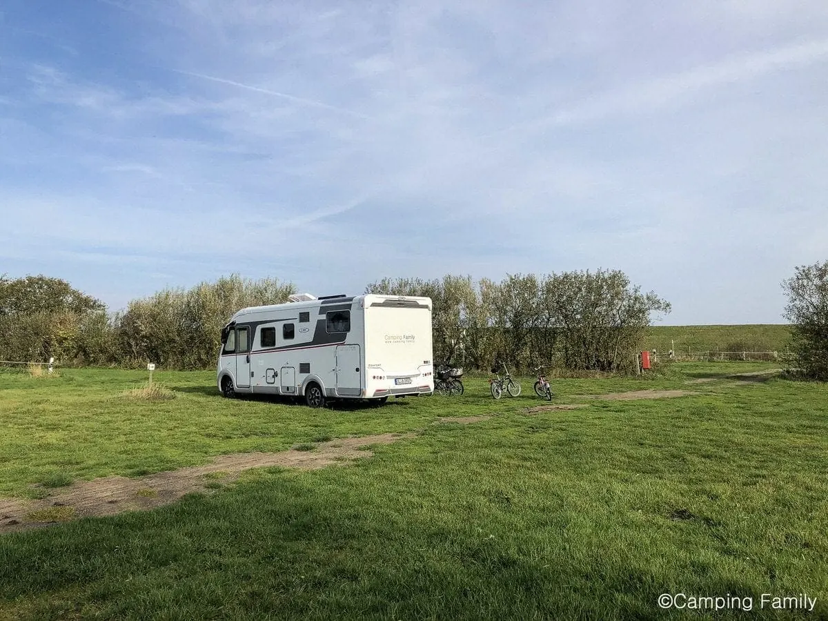 Es handelt sich hierbei um einen recht einfachen Platz auf einer großen Wiese, wo der hintere Teil für insgesamt 50 Wohnmobile vorgesehen ist. Der Platz selbst ist jetzt nichts Besonderes, obwohl er wegen seiner Lage aus meiner Sicht riesiges Potenzial bietet. Bei der Einfahrt zahlt man an der Schranke wie auch die Pkws dann 3,00 € und den Rest bezahlt man beim Betreiber, in diesem Fall einem älteren und sehr freundlichen Ehepaar.