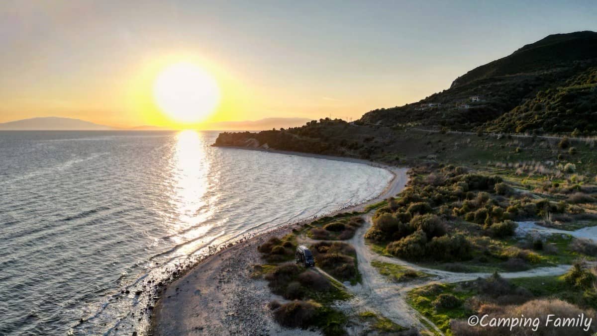 Das Navi zeigte den späten Nachmittag als Ankunftszeit an, und weil wir ohnehin spät dran waren und auch noch einkaufen wollten, entschieden wir uns für die Landschaftsroute an der Küste entlang. Wir fuhren lieber erst am nächsten Tag zu den Thermalquellen und suchten auf dem Weg ein schönes Plätzchen für die Nacht. Somit verließen wir Chalkidiki und wurden am Proti Ammoudia Beach bei der Stellplatzsuche fündig.