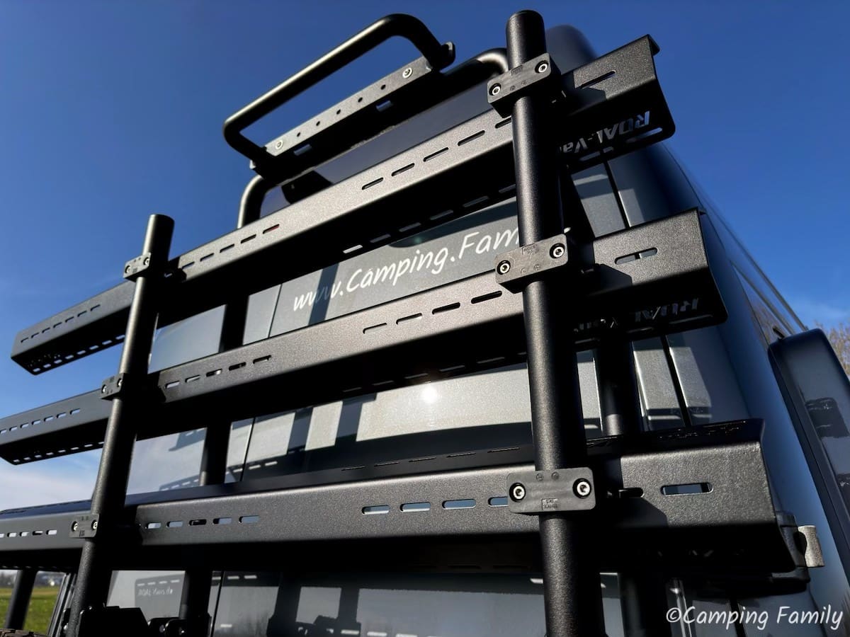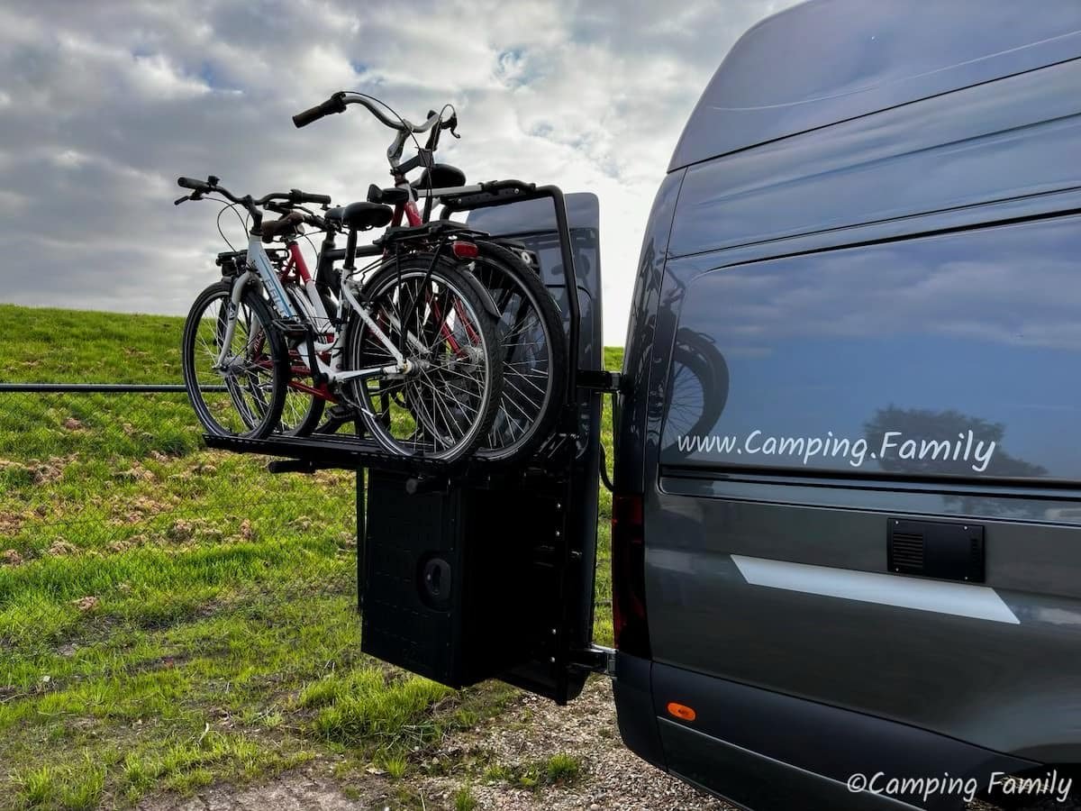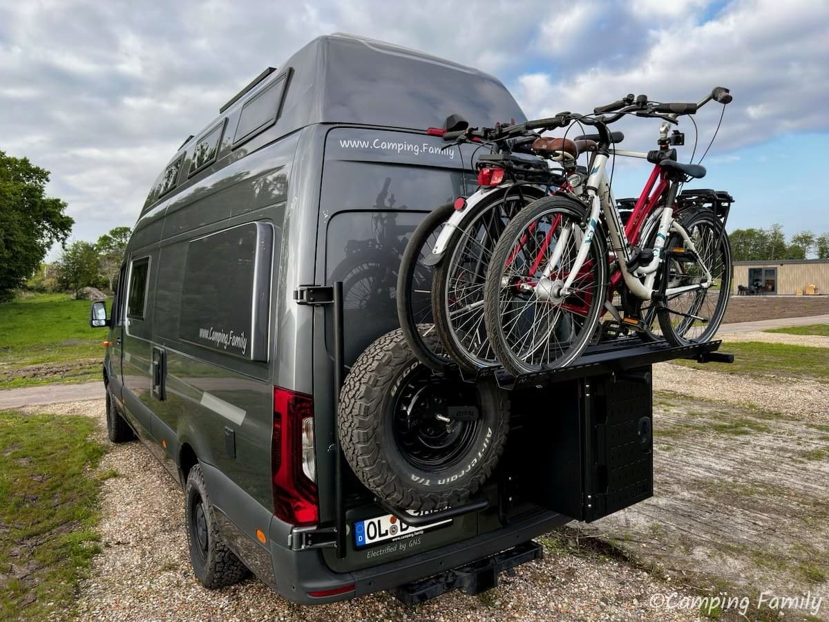 Der Fahrradträger von ROAL-Vans kann mit bis zu 60 Kilo beladen werden und es passen auf Wunsch bis zu vier Räder auf den Träger. Montiert wird er an der rechten Hecktüre und die Fahrräder werden daran mit Armen von Fiamma oder Thule befestigt. Beim Öffnen der Hecktüre können die Räder auf dem Träger verbleiben und werden einfach mit der Tür zur Seite umgeschwenkt. Hier muss man nur beim Zurückschwenken gut auf den Hinterkopf aufpassen.