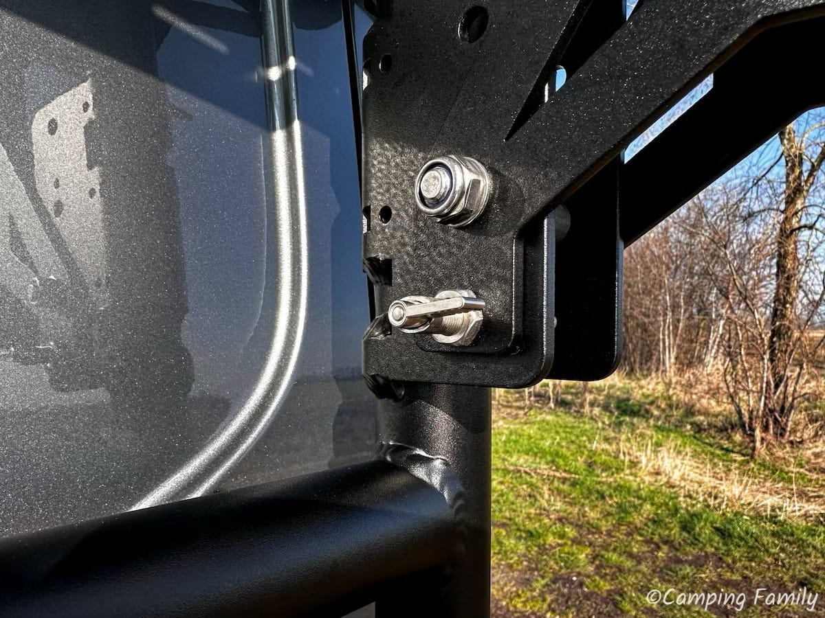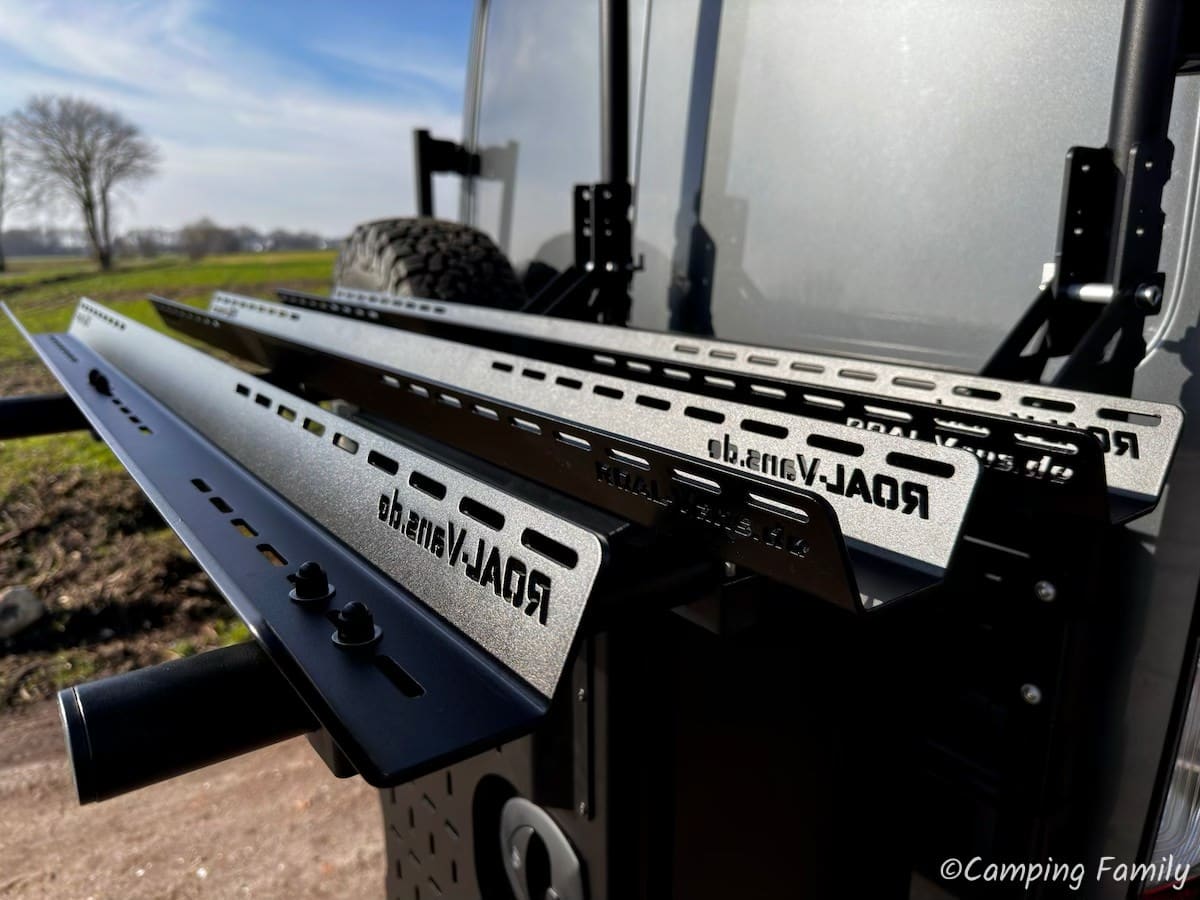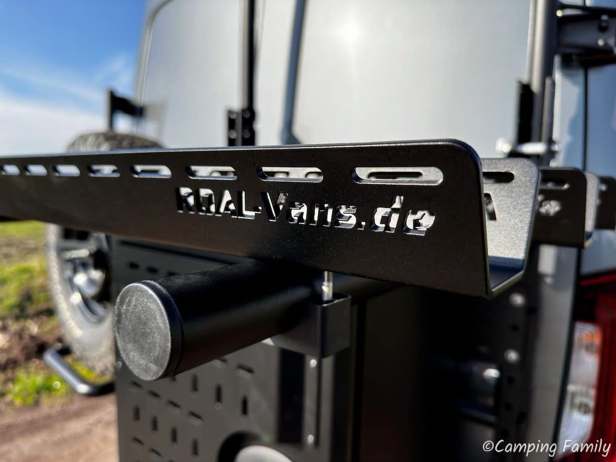 Die Außenseite der Tür bietet ebenfalls Möglichkeiten zur weiteren Befestigung von sperrigen Dingen wie Sandbleche, Kanister, oder Ähnlichem, wobei man die Gesamttiefe des Fahrzeugs im Blick behalten sollte.