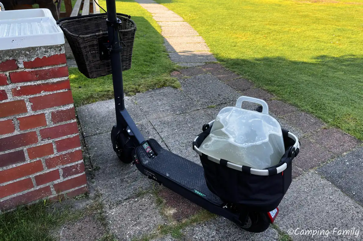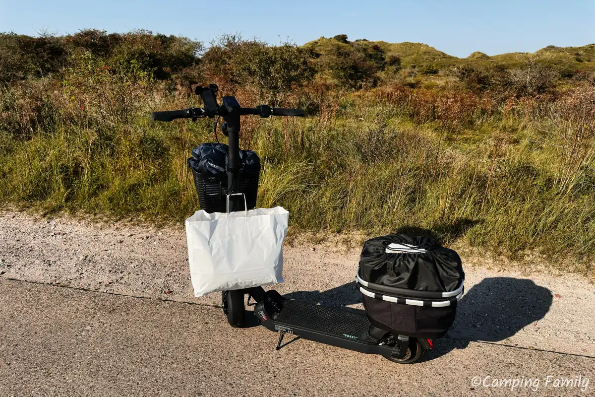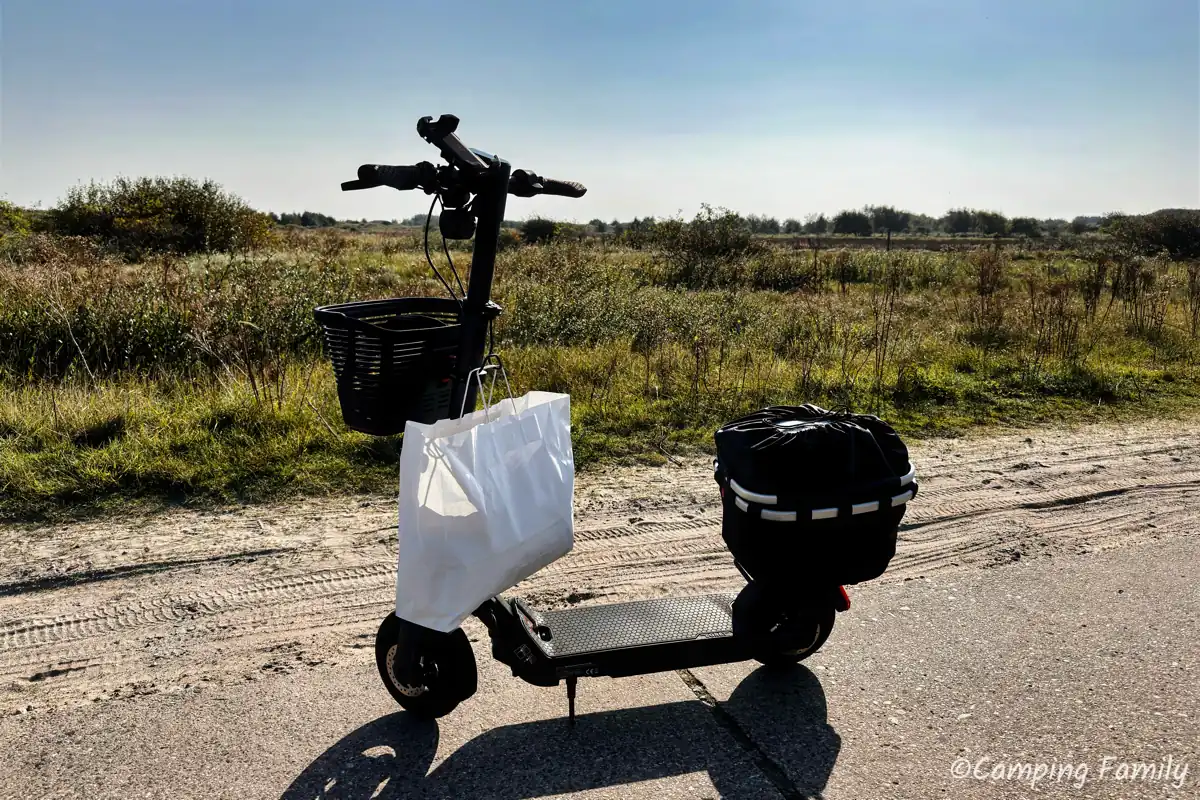 Der Egret Pro wurde auf Borkum somit je nach Situation mit den gewünschten Körben bestückt und damit waren auch größere Einkäufe oder der Transport vom Grauwasser auf dem Campingplatz kein Problem. Egret gibt für den Gepäckträger eine garantierte Belastbarkeit von 10 kg an, aber der Transport einer vollen Kassettentoilette ist darauf auch ohne Probleme möglich.