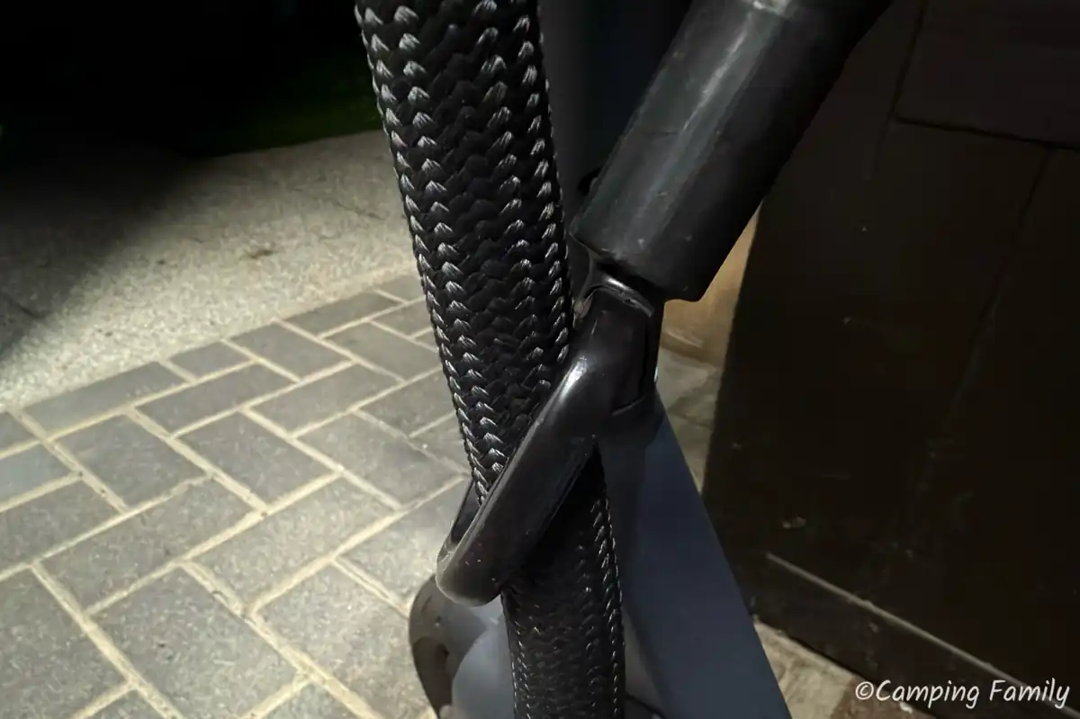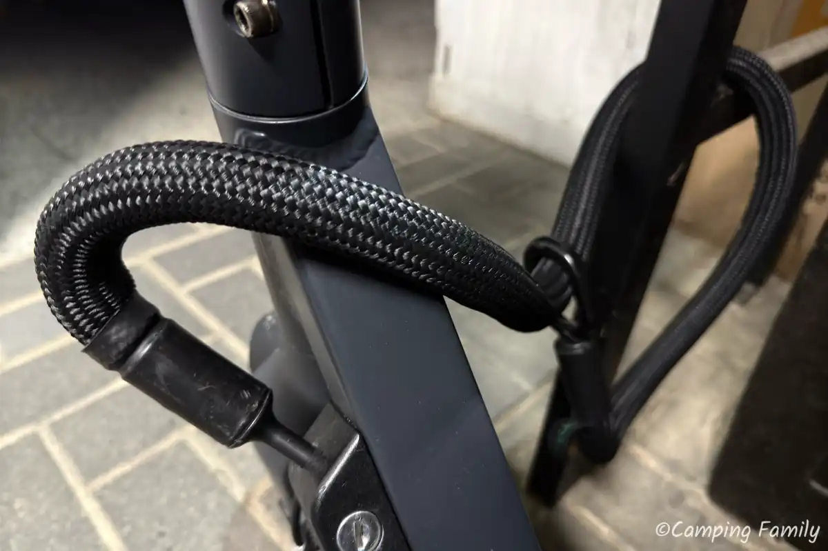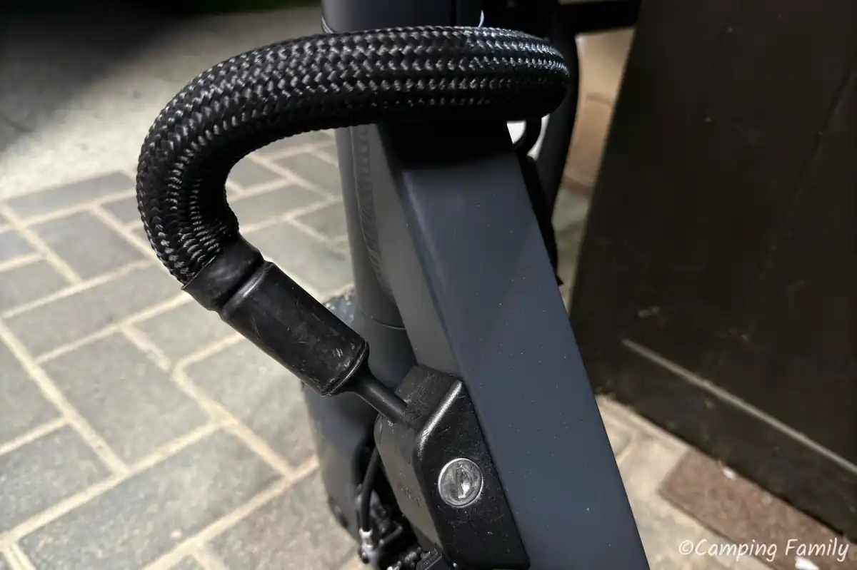 Bei nahezu allen E-Scootern vermisst man eine praxistaugliche Lösung, um diese anzuschließen. Es scheitert dabei fast immer an geeigneten Befestigungsorten für ein Schloss am E-Scooter. Auch hier hat Egret mit seinem Rahmenschloss mitgedacht. An der unteren Seite befindet sich eine Vorrichtung, um ein flexibles Seilschloss von tex-lock zu befestigen.