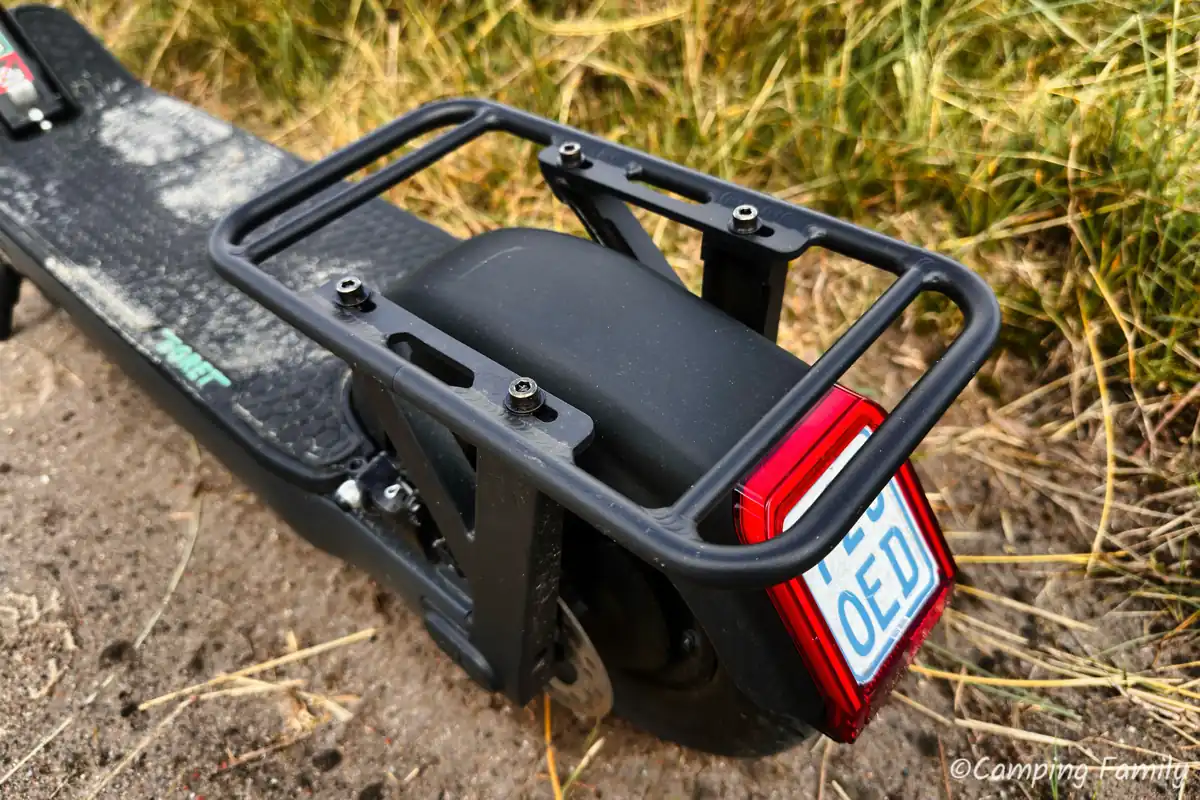 Bei fast allen E-Scootern gibt es von Hause aus keine wirklichen Transportmöglichkeiten. Im Zubehörhandel findet man natürlich entsprechende Taschen für die Montage an der Lenkerstange*, jedoch muss man hierbei immer prüfen, ob sich diese auch ohne zu großen Aufwand, also „mal eben“ montieren und demontieren lassen. Bei höhenverstellbaren Lenkern ist das dann mit den Befestigungspunkten je nach Tasche auch eine kleine Herausforderung. Diese Taschen bewegen sich vom Volumen her bei 2 bis 4 Liter, sodass man hier gerade einmal Geldbörse, Schlüssel und evtl. ein Schloss unterbringen kann. Selbst an einen kleinen Einkauf ist hier ohne Rucksack nicht zu denken.