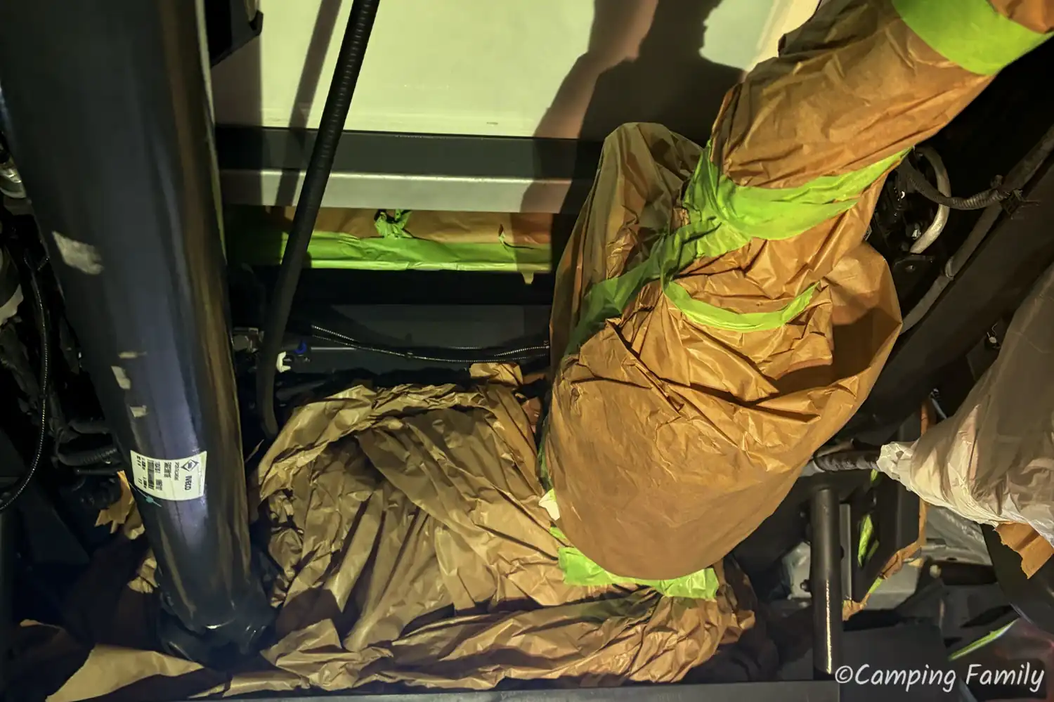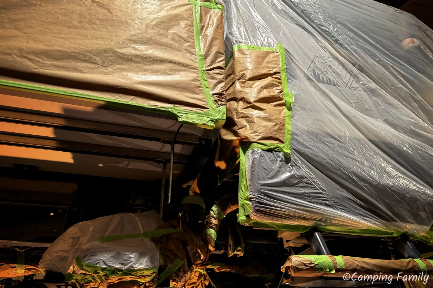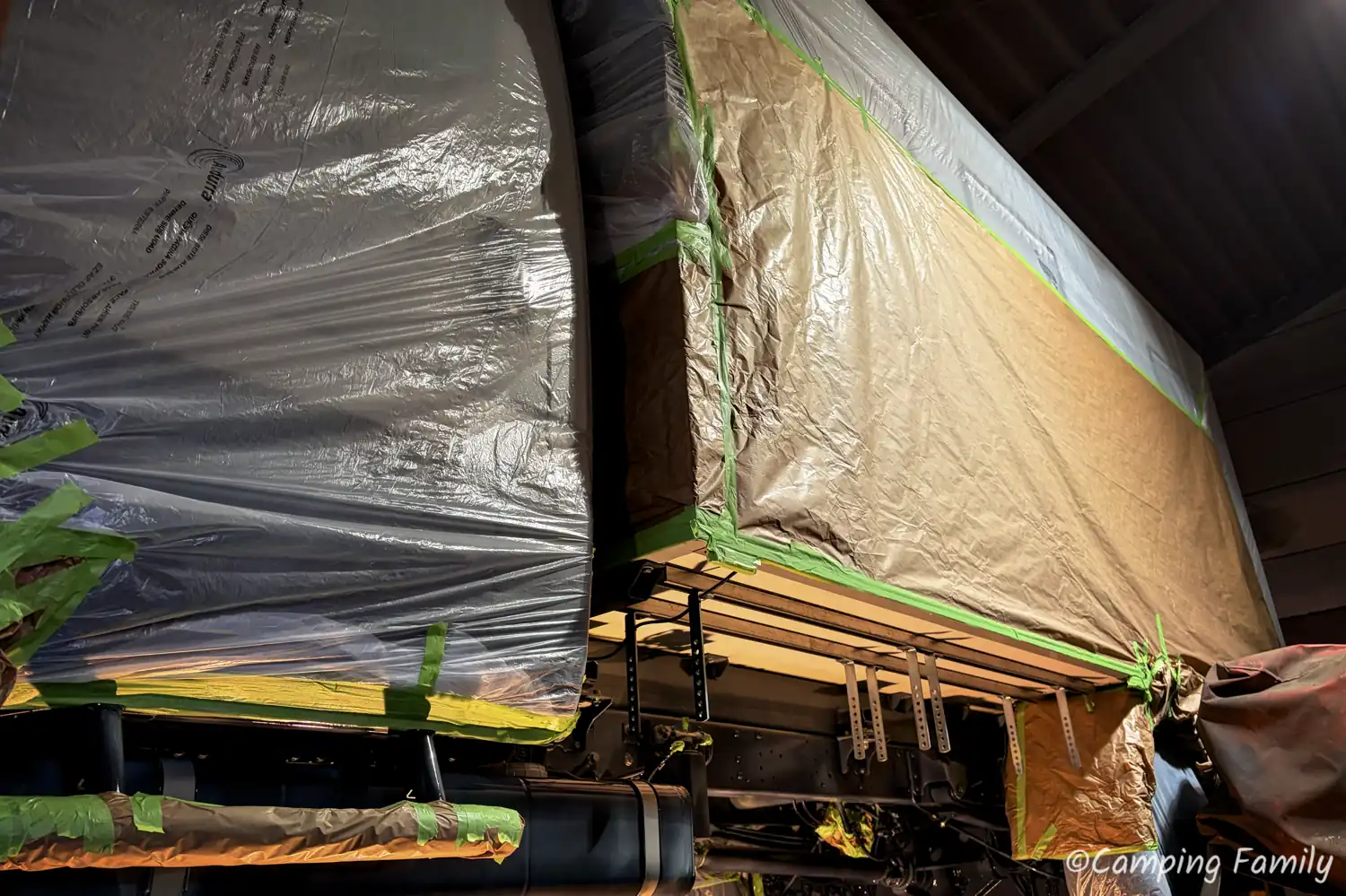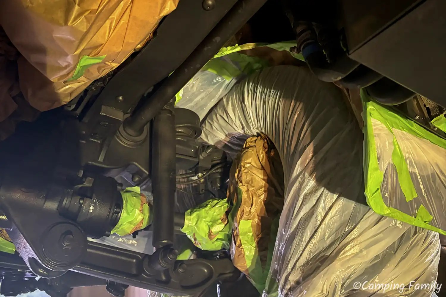Ganz nach dem Kunstprojekt des Künstlerehepaars Christo und Jeanne-Claude, wurde unser Daily mit Folie abgeklebt, also all die Teile, welche nicht versiegelt werden sollen oder dürfen. Das ist an einem Wohnmobil schon eine Menge an Rohren, Schläuchen und Anbauteilen, sodass man den Zeitaufwand für diesen notwendigen Schritt nicht unterschätzen sollte.