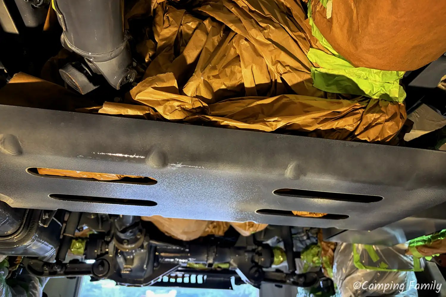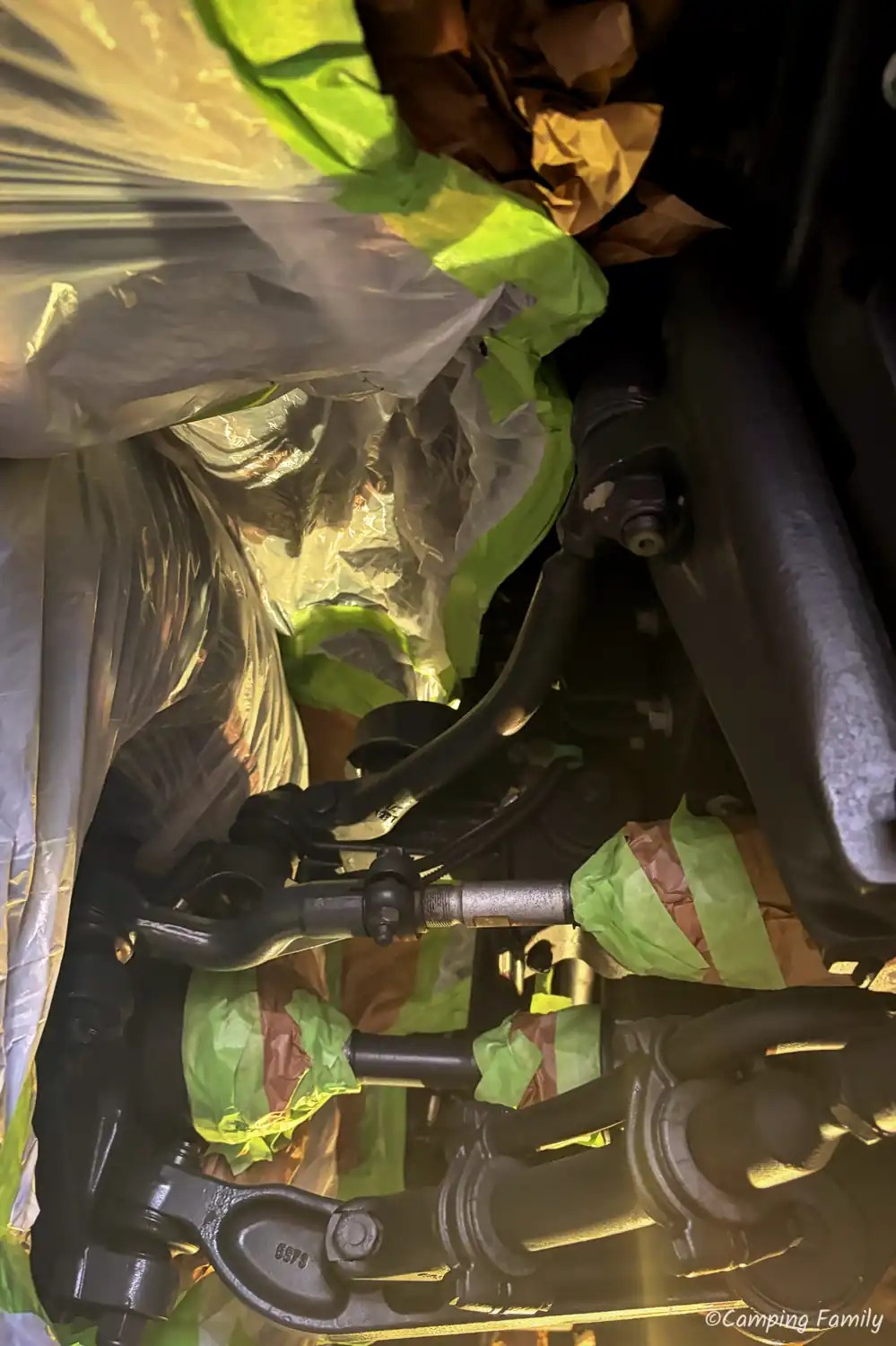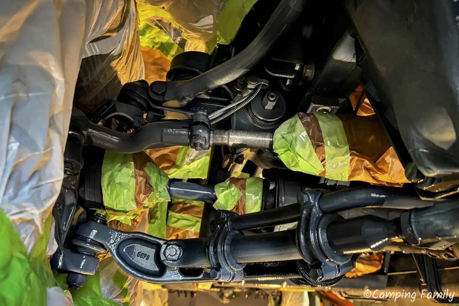 Ganz nach dem Kunstprojekt des Künstlerehepaars Christo und Jeanne-Claude, wurde unser Daily mit Folie abgeklebt, also all die Teile, welche nicht versiegelt werden sollen oder dürfen. Das ist an einem Wohnmobil schon eine Menge an Rohren, Schläuchen und Anbauteilen, sodass man den Zeitaufwand für diesen notwendigen Schritt nicht unterschätzen sollte.